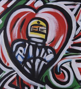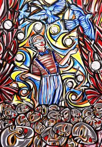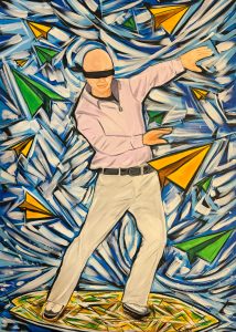 Giubba’s latest works have been defined in many ways, as certain elements can be identified that might lead us to think of specific styles (pop art, expressionism, graffiti art, some surrealist references, etc.), but this would be misleading and would distance us from the final essence of the artistic production. Irony and dramatic effect coexist in the work. The coexistence of subjects and sometimes grotesque situations, seemingly presented without logical connections, is the result of an elaboration by the artist suggesting a melting pot of diverse realities, using strong and pure colors that evoke colored LEDs, advertising, comics, and cartoons. Objects, characters, and colors float on the canvas, where nothing is static, where everything is in continuous transformation, everything is in balance, and the sense of impermanence translates into an invitation to search for an escape route. The human drama, seen through the artist’s eyes, also becomes irony and play. It is the game that the artist wants to engage the viewer in, the existing that he has appropriated, the phenomenon he has shaped, the dream and memory to which he has made modifications; it is the elaboration of a set of information and messages that he leaves for others to decipher, an invitation to enter his world.