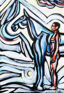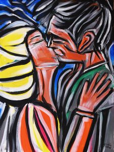 For about two years, the artist has moved to Rome, where he has created new works. At first glance, looking at his paintings, one might think we are facing “spontaneous” painting; the gestural and rapid brushstrokes might deceive us: in reality, these are thoughtful works, rigorous in composition, albeit with a natural predisposition for improvisation, as if it were a jazz composition. In the works produced in Rome, in his studio in Trastevere where he currently works, the artist introduces an element of irony, a laughter that he considers a form of “meditation,” an attitude of not taking himself too seriously.