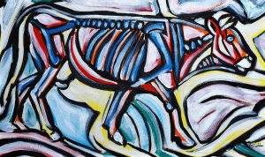 What he does is an operation of dismantling some old works: armed with a cutter, he “vivisects” his old pieces, pulling out characters that belonged to another pictorial context. The characters thus acquire their own autonomy, their own life, accentuated by a new light: it is the brushstrokes of white that invigorate the works, which thus become “new works” in their own right.